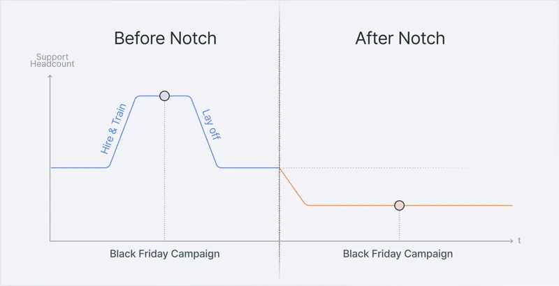 On a growth trajectory? Black Friday or seasonality peak? Major product launch? You don’t need to hire extra staff or compromise service quality — Notch scales your support, instantly and effortlessly.