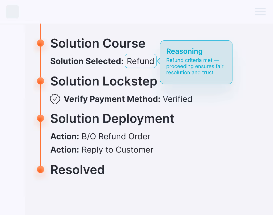Each decision is explainable and mapped to your solution & policy business rules, ensuring precise, governed resolution.